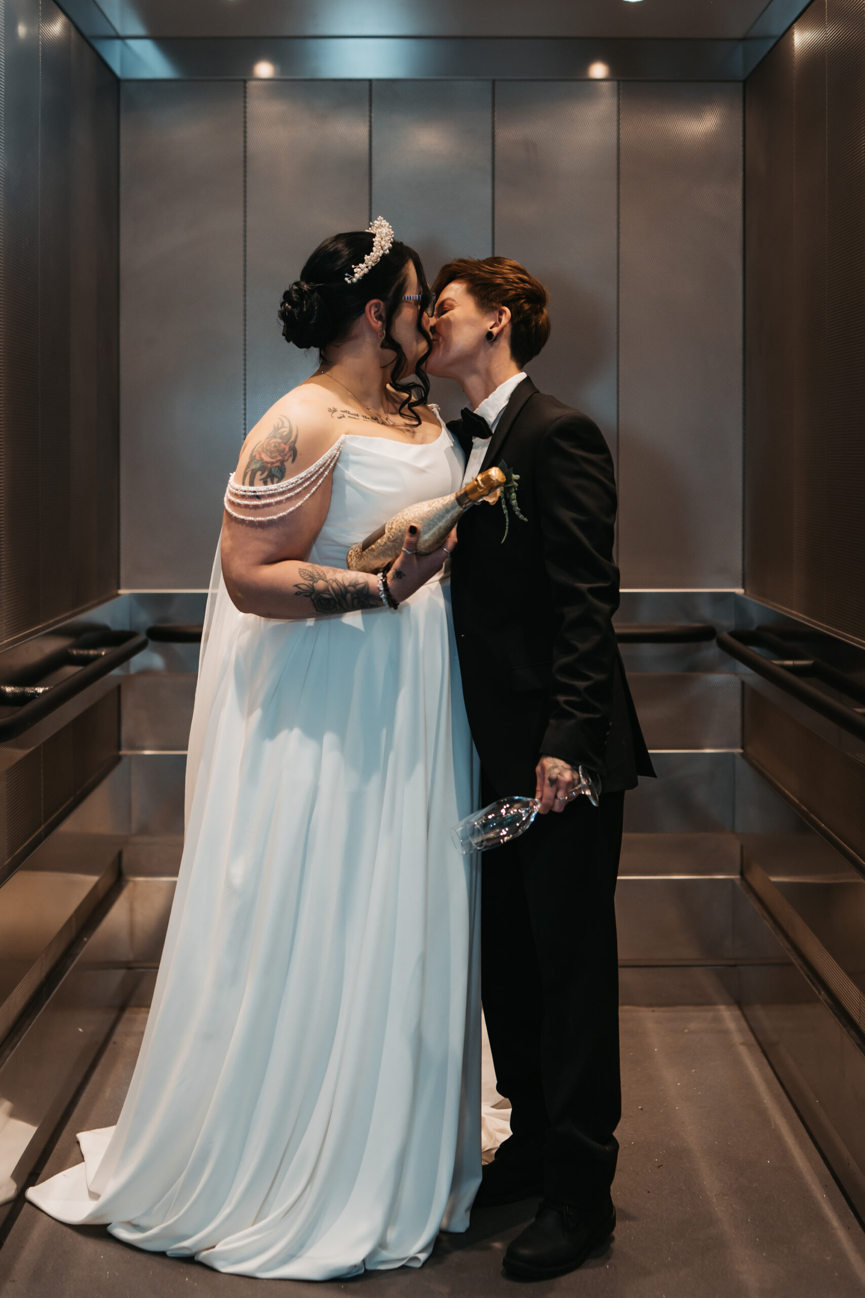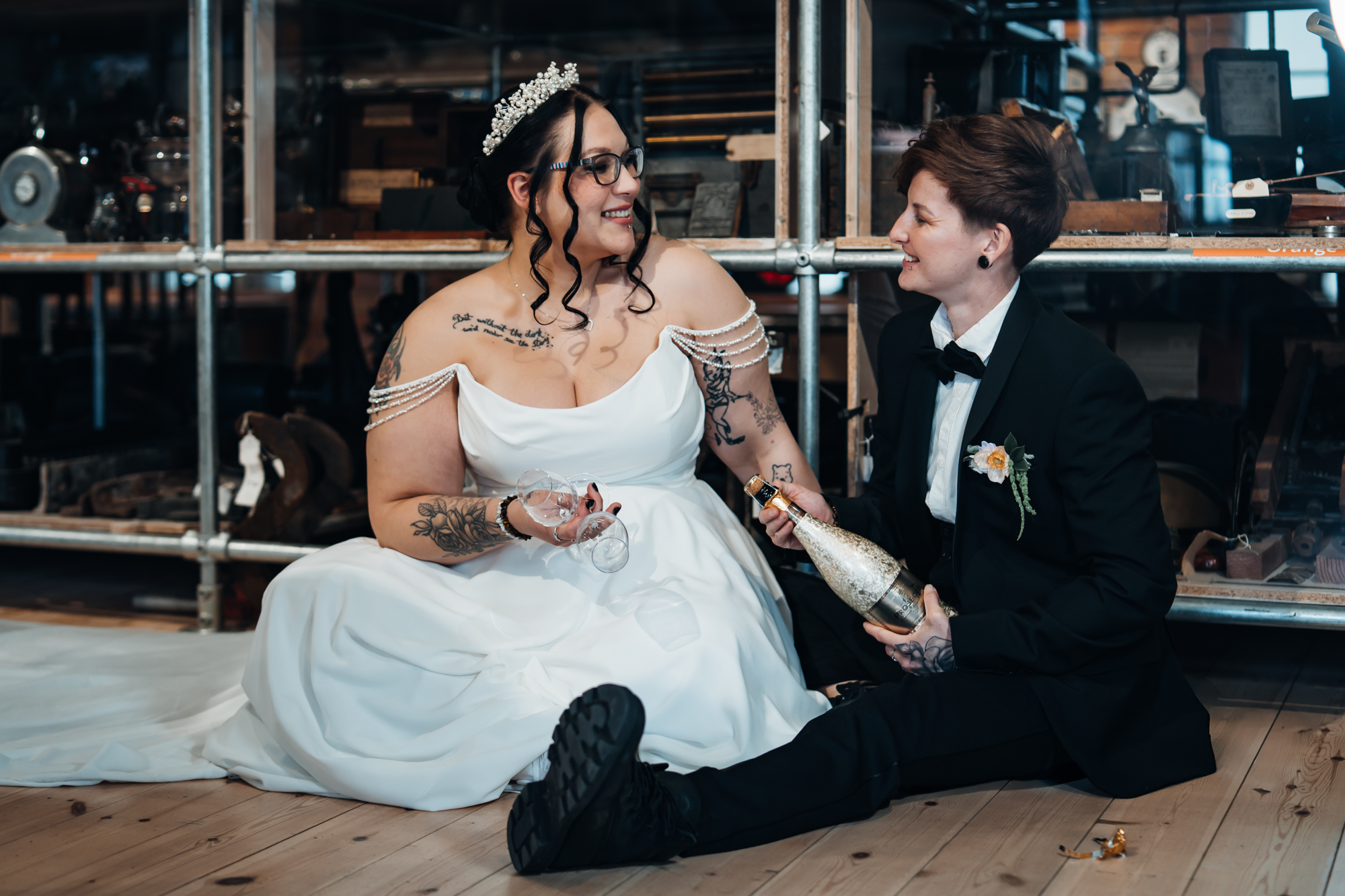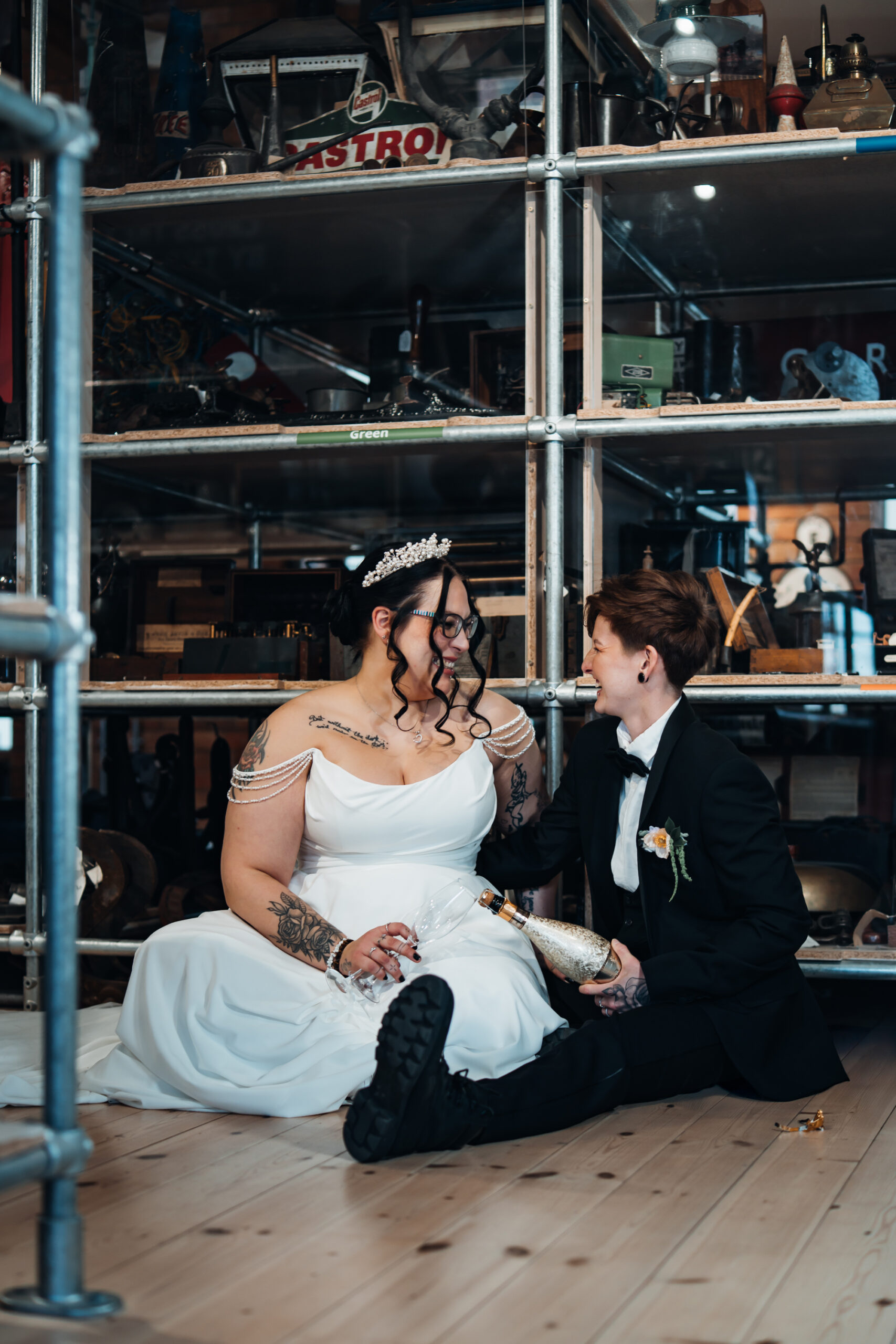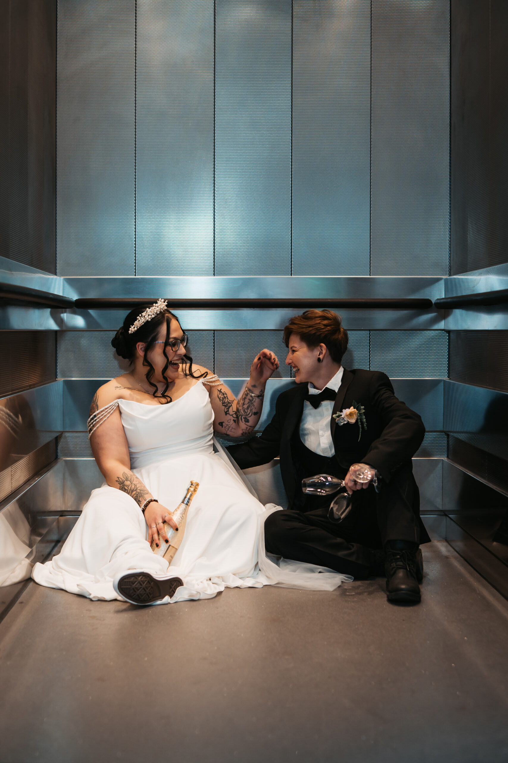 What really made this shoot was the fact that our models were just so into each other. Their chemistry shines through and certainly made my job easy as a photographer. Full of laughs, smiles, fun and intimacy, we imagined that Sammy and Liv had escaped their party, maybe a bit tipsy for some alone time on their wedding day.