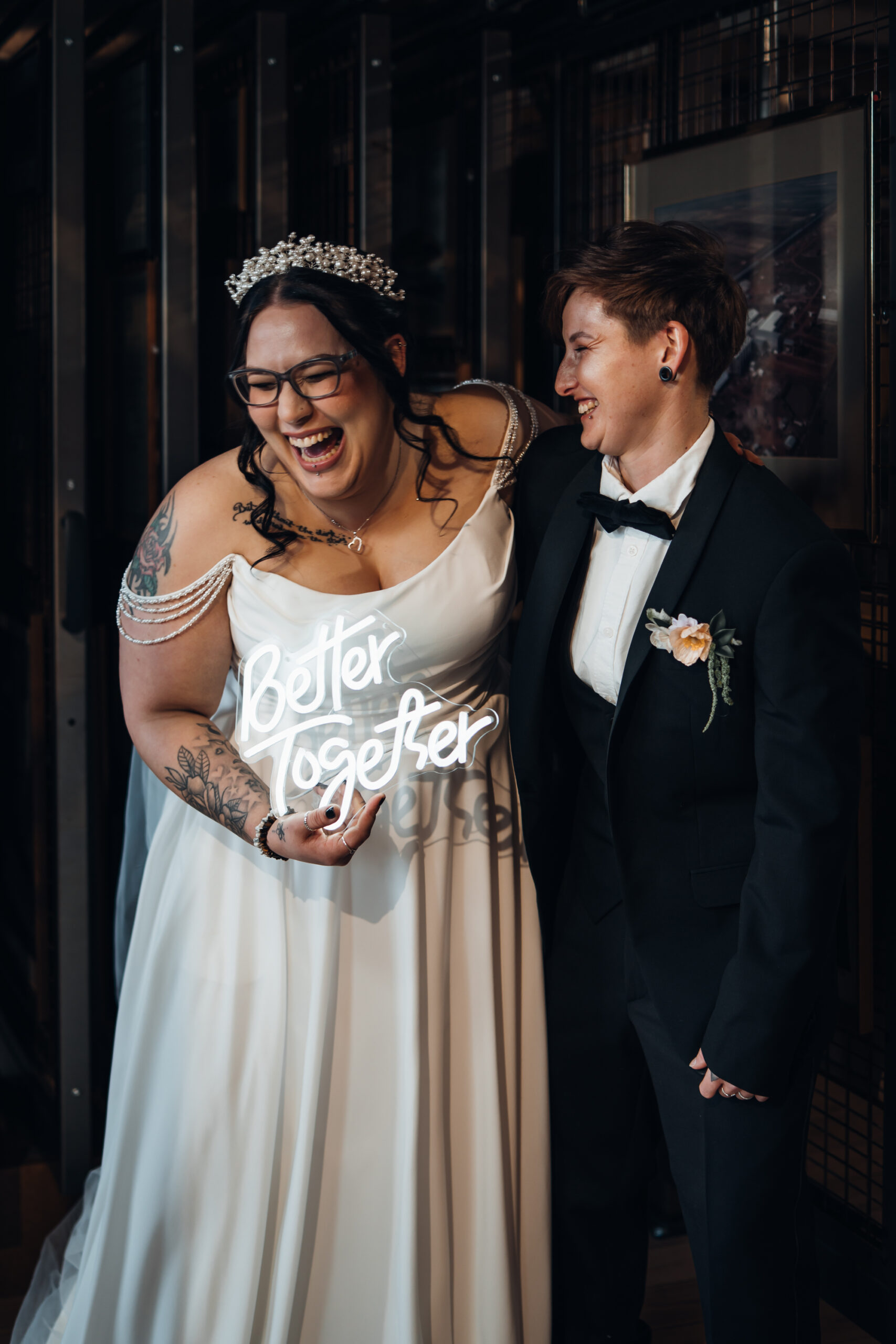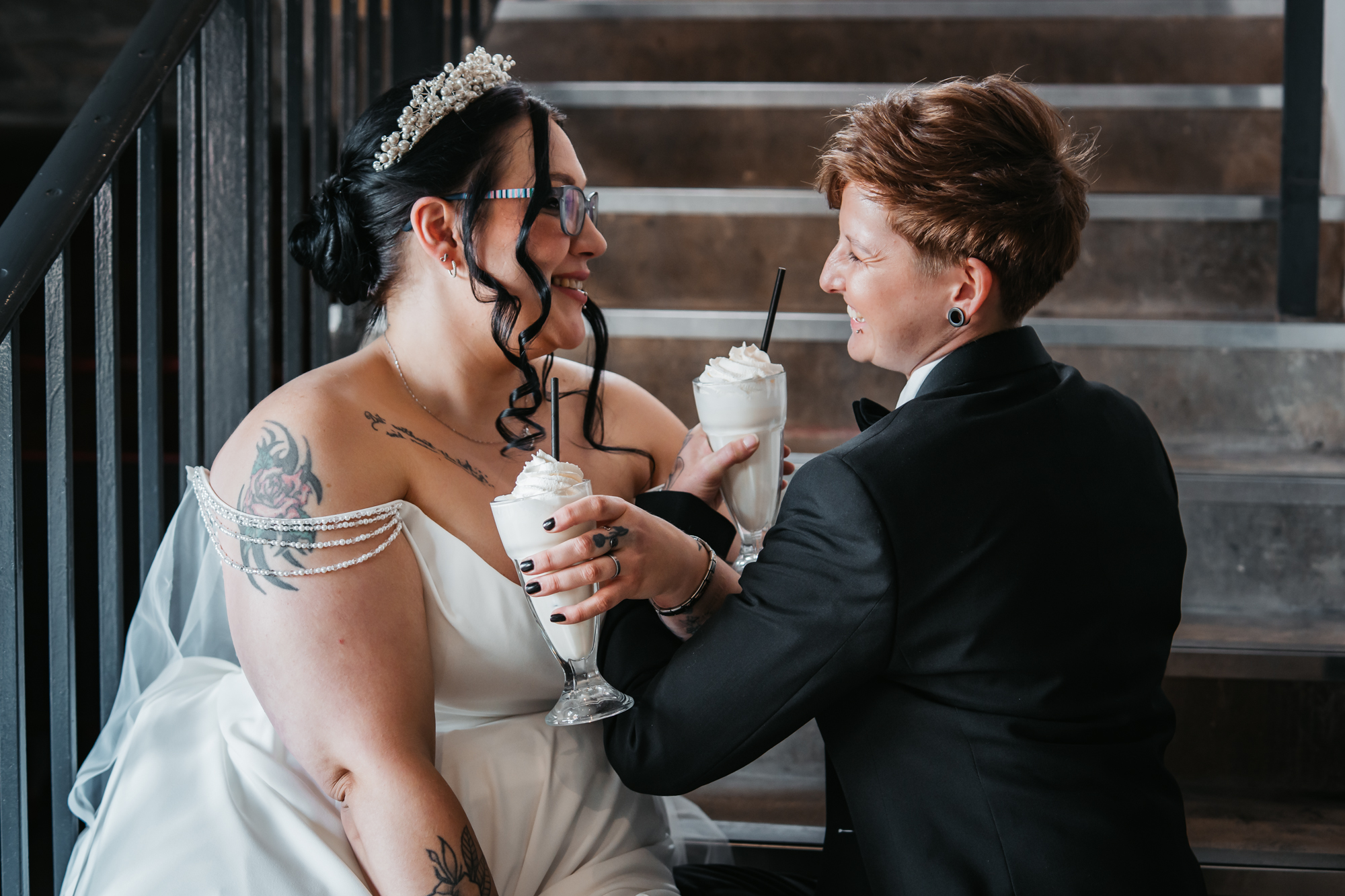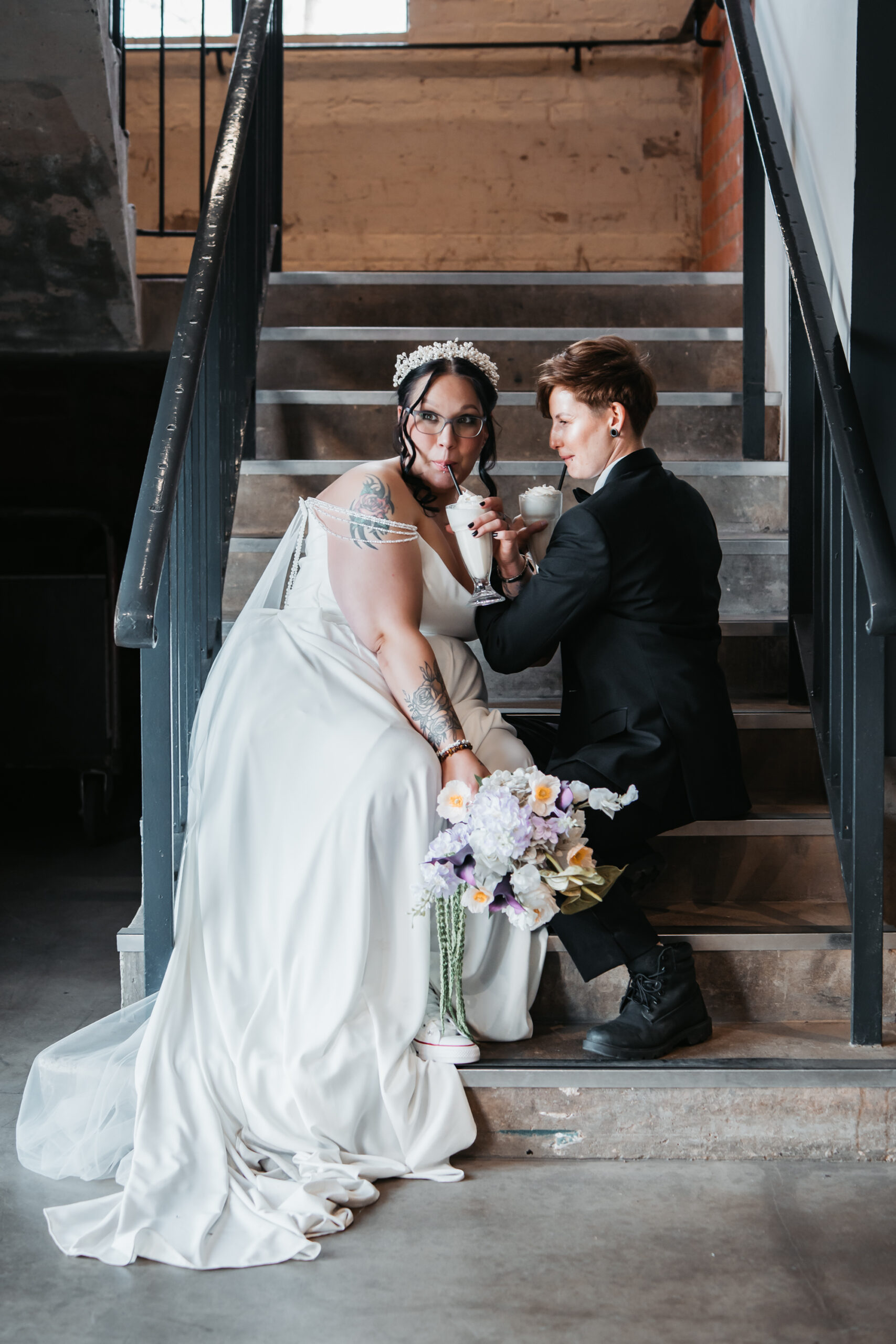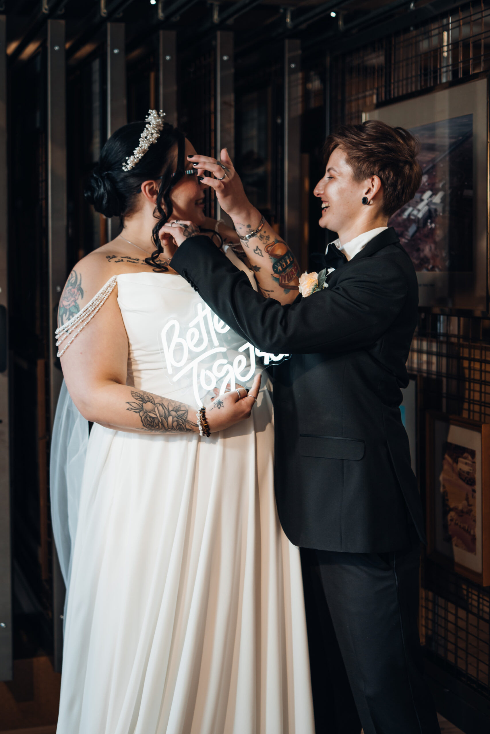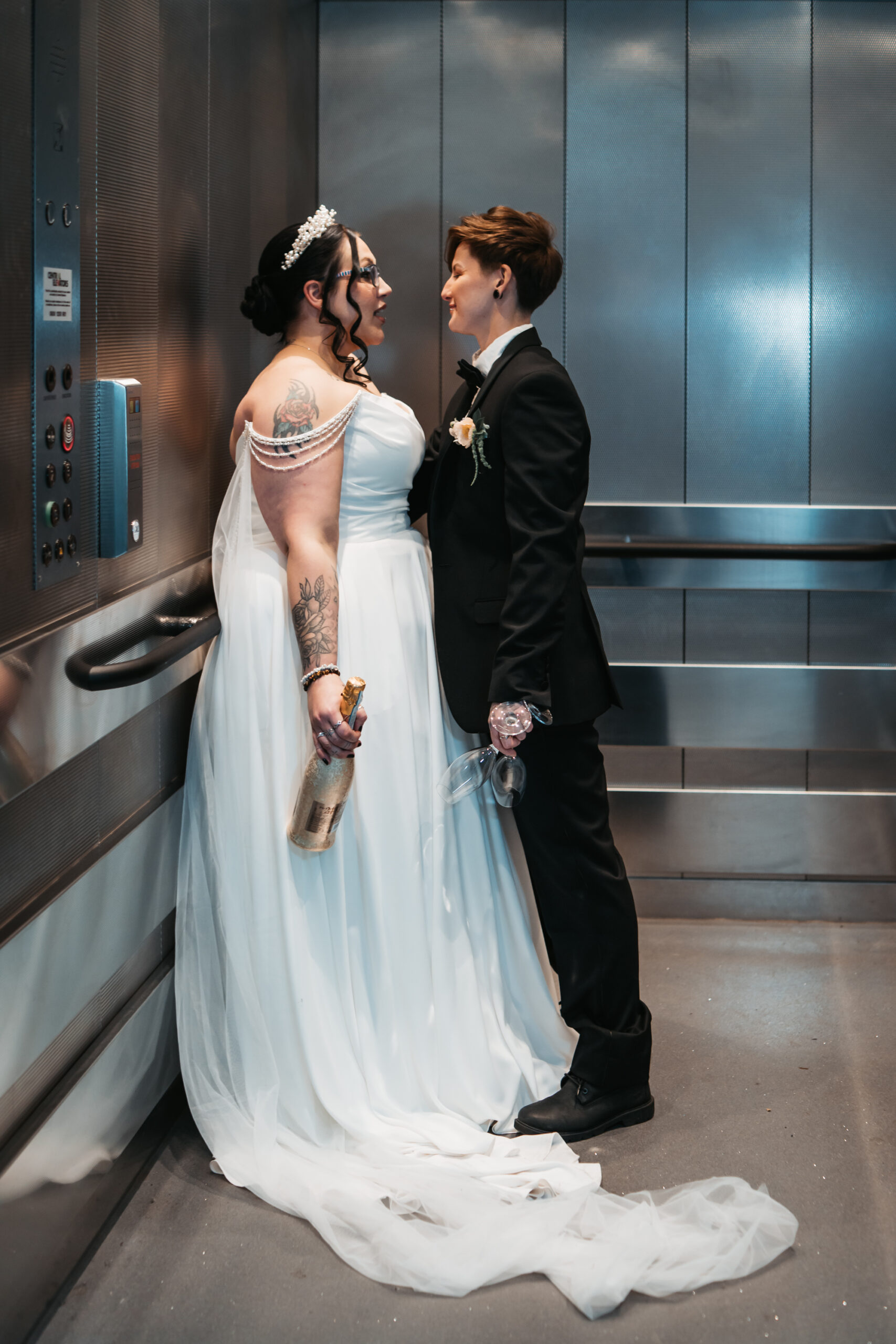 What really made this shoot was the fact that our models were just so into each other. Their chemistry shines through and certainly made my job easy as a photographer. Full of laughs, smiles, fun and intimacy, we imagined that Sammy and Liv had escaped their party, maybe a bit tipsy for some alone time on their wedding day.