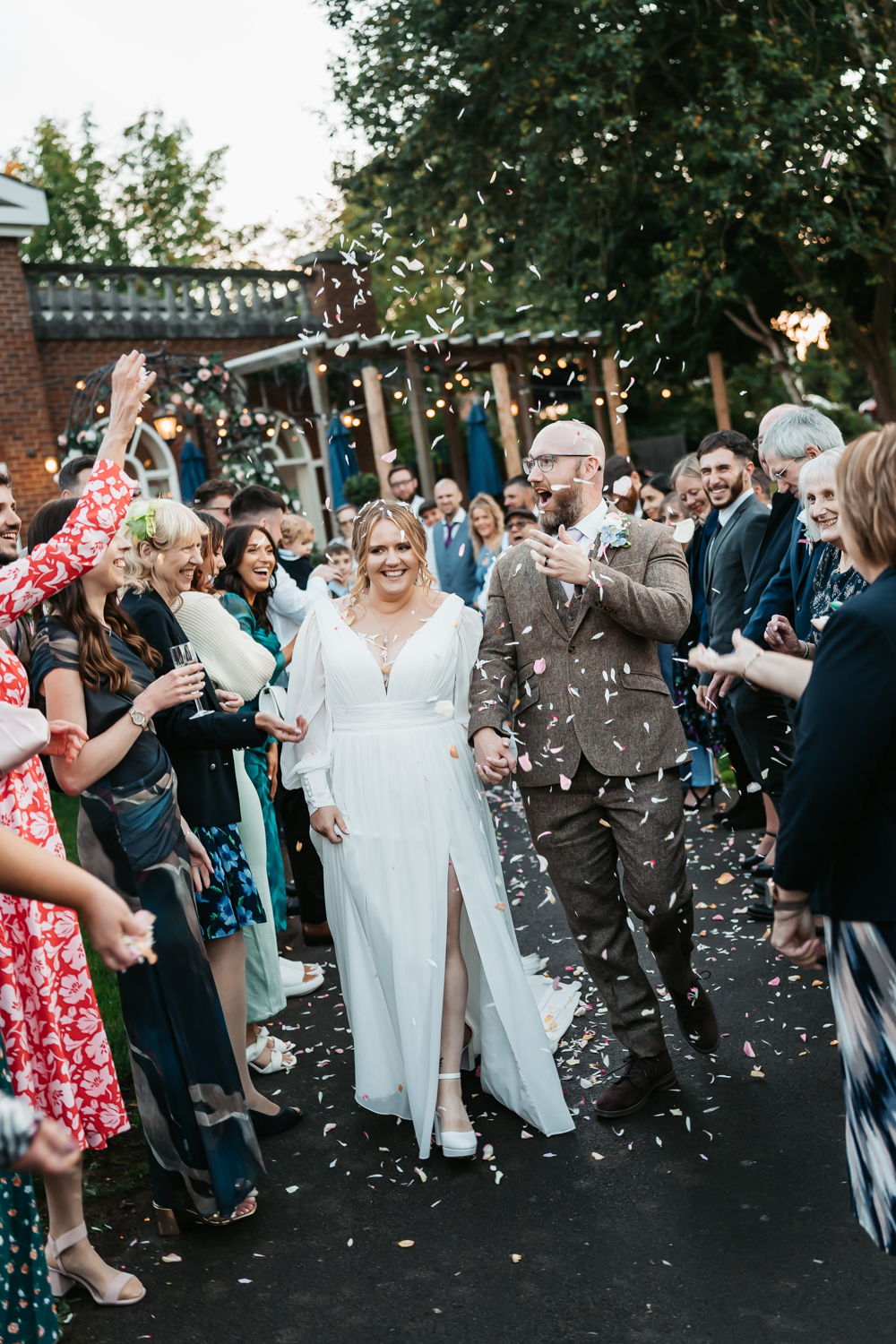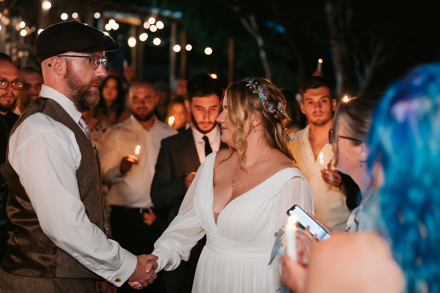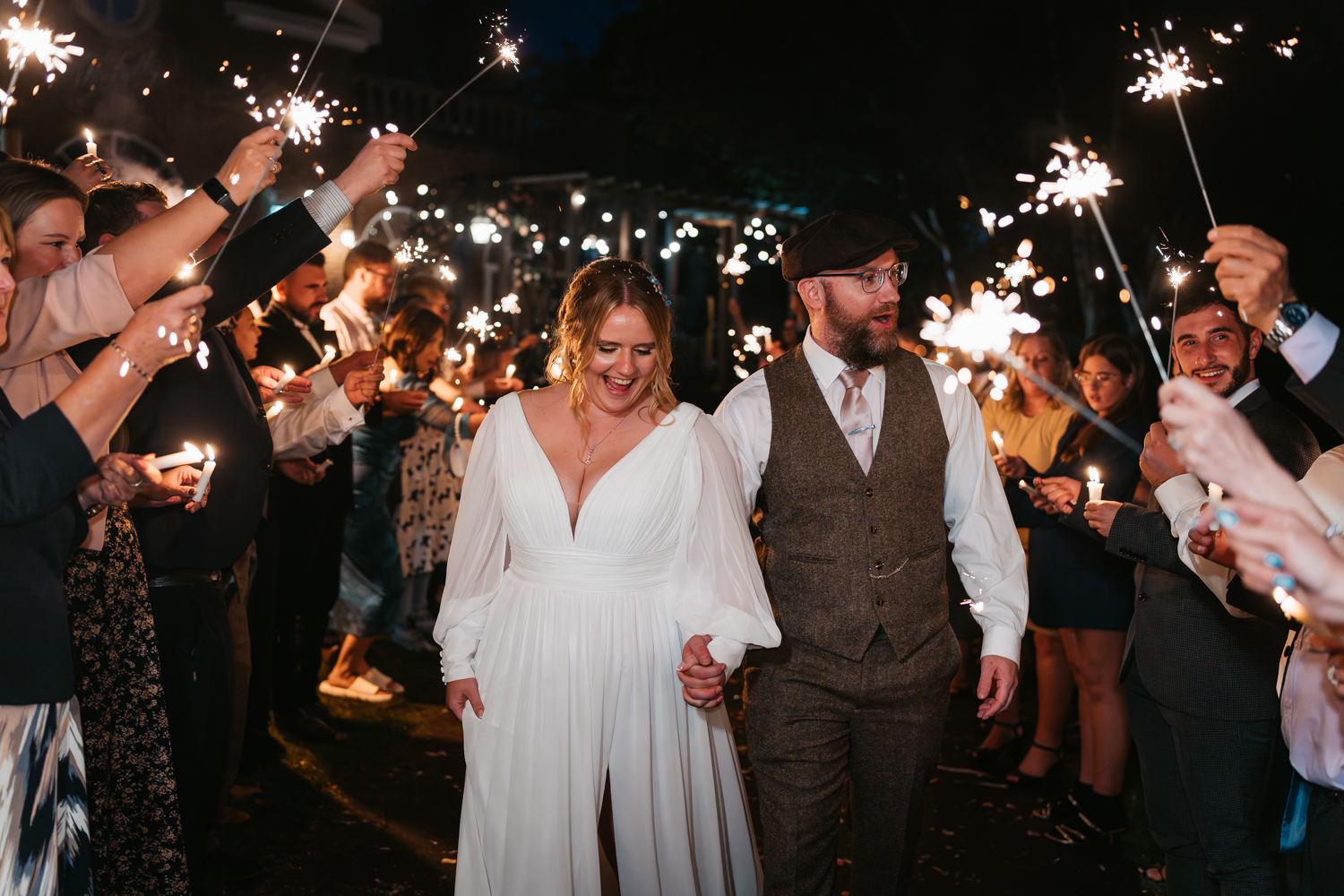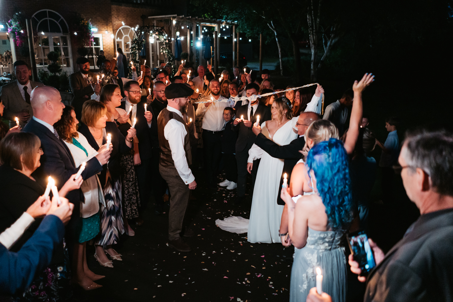 Natasha and David made full use of the outdoor space in spite of the rain and squeezed a confetti shot, sparkler moment and candlelit handfasting into the dry spells.